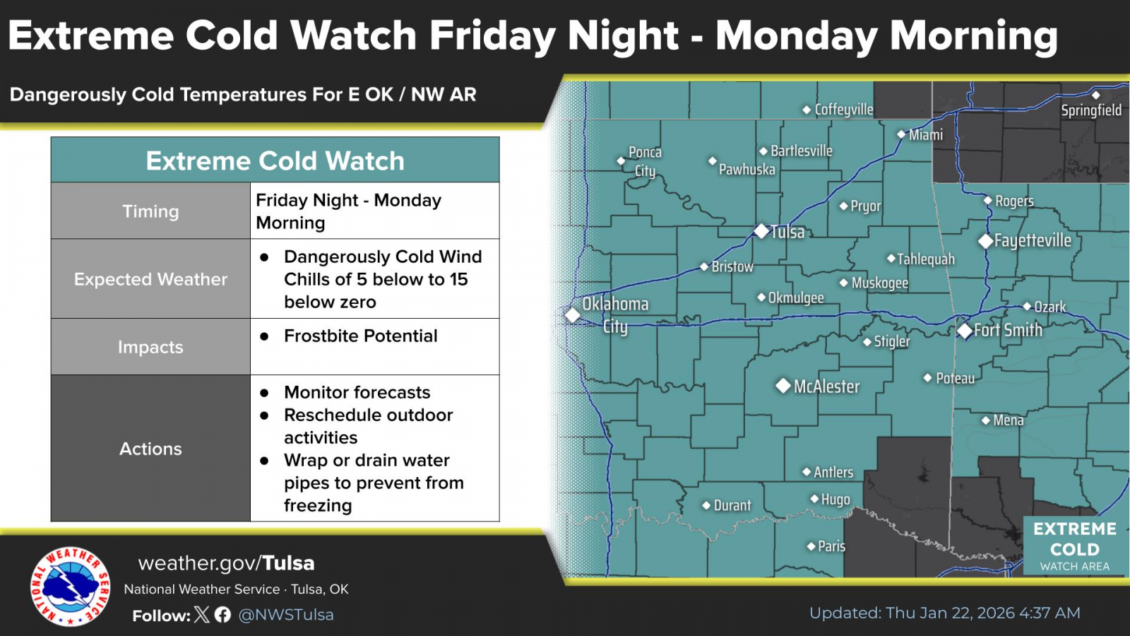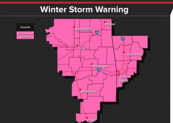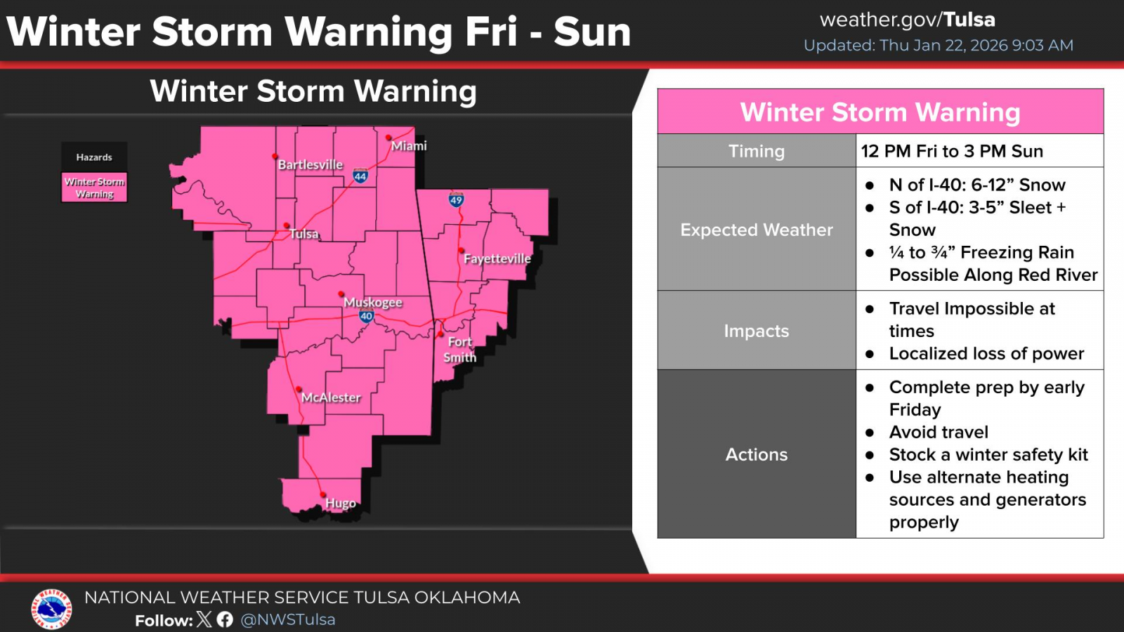 A Winter Storm Warning has been issued by The National Weather Service from noon Friday to 3 p.m. Sunday for Northeast Oklahoma.